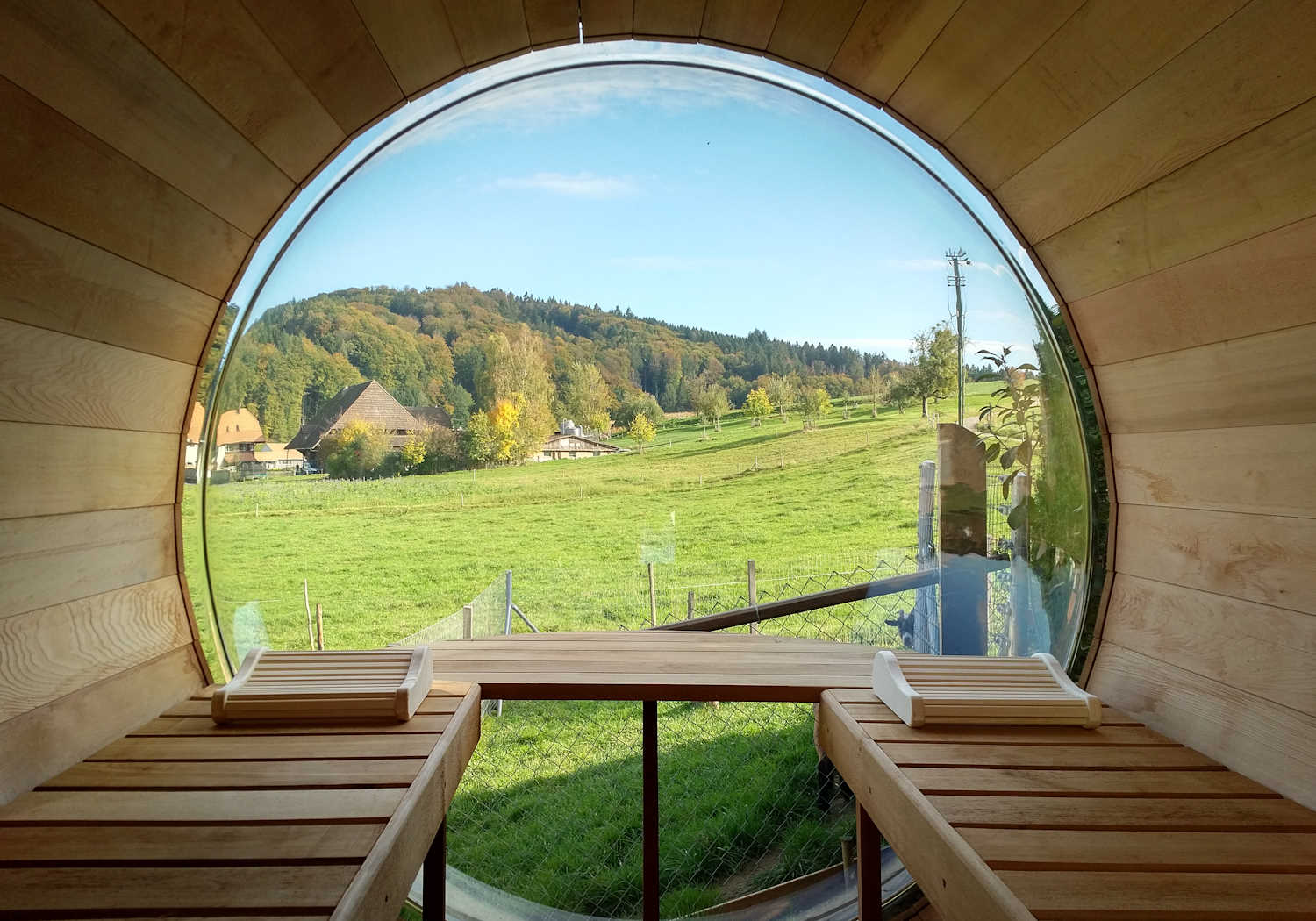 Fass-Sauna mit Terrasse und Ausblick. Benutzung ist im Gegensatz zum Whirlpool auch nach 21h möglich
